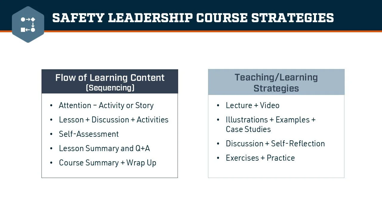 The content for this slide deck has a consistent flow of learning. Each module begins with either an activity or story to gain attention and establish relevance. It then moves it a blend of lecture, discussion, and activities, wrapping up with a lesson summary and Q+A. Key aspects of this slide deck design included module title slides with progress indicators to orient facilitators and learners to where they were in the course, clean and simple content slides, discussion and activity slides that used consistent styles and included visual icon cues throughout to orient facilitators and learners to places were there was an activity to do or notes to write down in the participant guide. At the end of the course, learners are encouraged to review their completed self-assessment and develop an action plan with steps they would take in the next few months to further develop their skills as a safety leader.