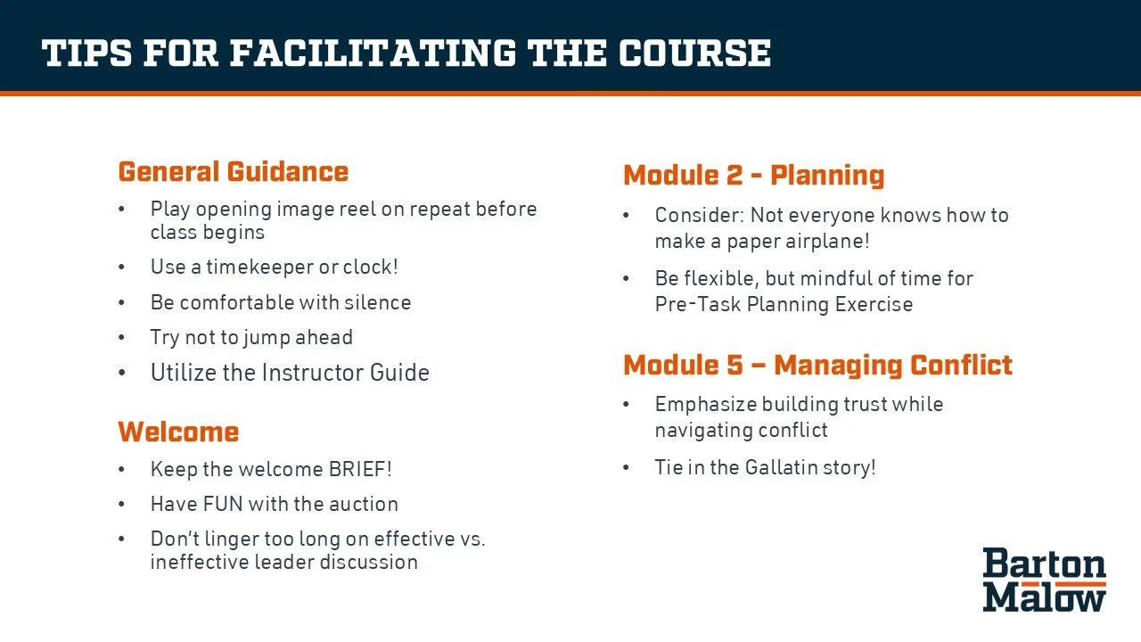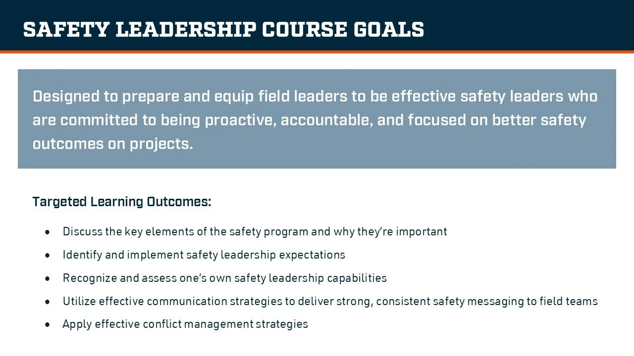 Project Goals: This in-person, instructor-led course is designed to prepare and equip field leaders to be effective safety leaders who are committed to being proactive, accountable, and focused on better safety outcomes on projects. The course is delivered in five modules, delivered over the course of six hours, and limited to 12-15 team members per session to encourage discussion. The course covers key elements of the Barton Malow safety program, safety leadership expectations, building essential safety leadership skills, and assessing one’s own safety leadership capabilities in order to create an action plan for further development.