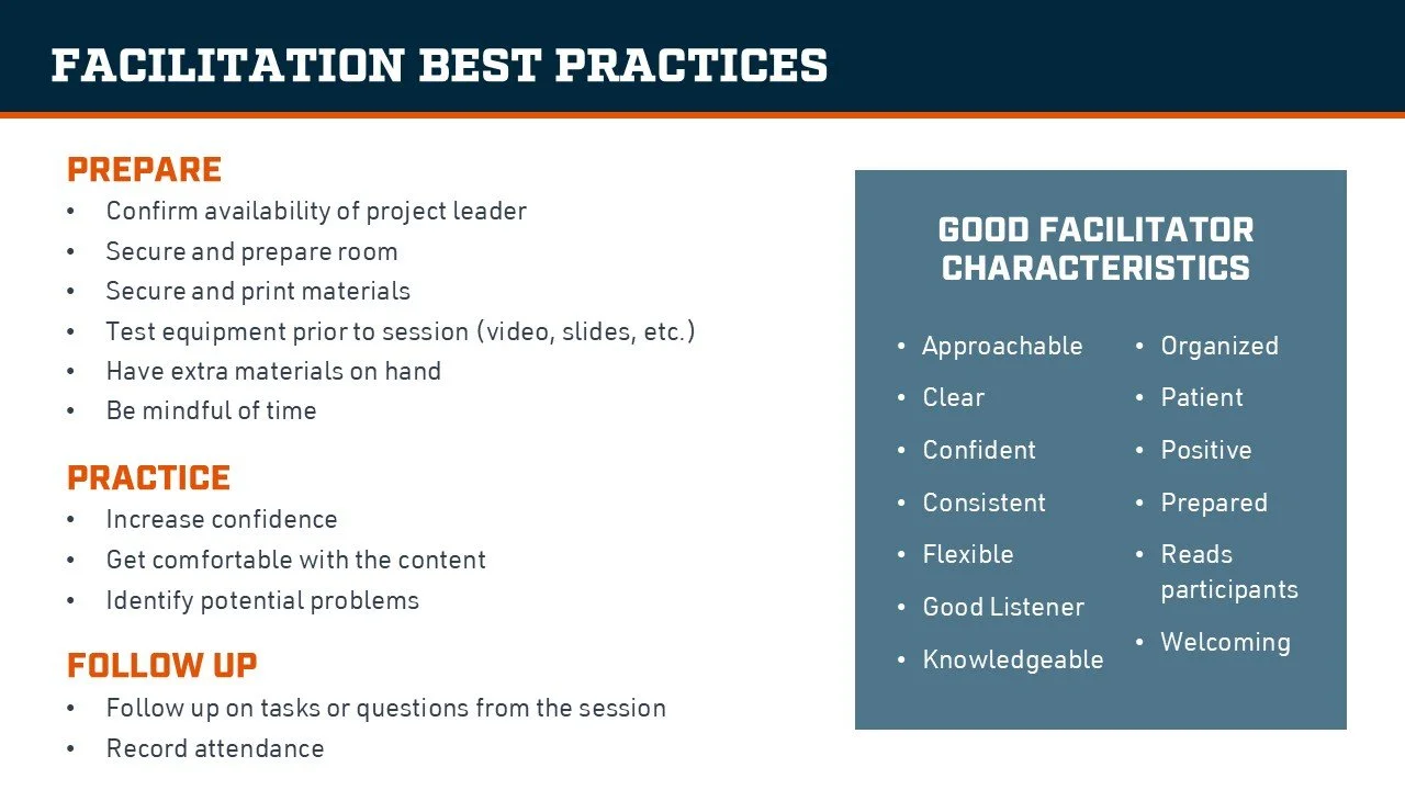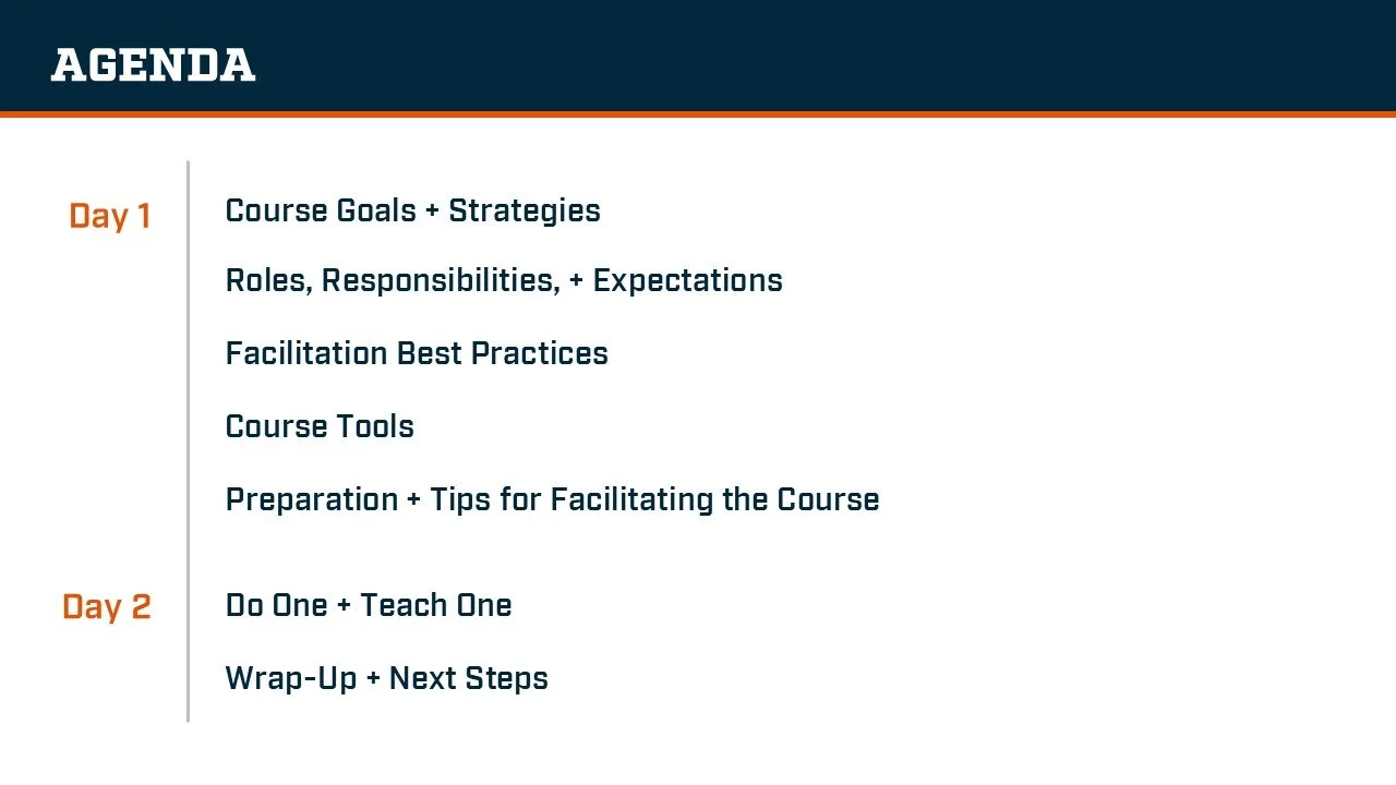 The train-the-trainer workshop was designed using the watch one, do one, teach one model. Facilitators are expected to take the course, focusing on participation, not prepping to facilitate. Then they participate in the train-the-trainer workshop which walks them through the components and structure of the course, but also includes helping them lean in to their strengths by getting to know their presentation style, and best practices for facilitation. This strategies implemented in this workshop were intended to level up facilitators’ skills and provide a consistent experience for all learners.