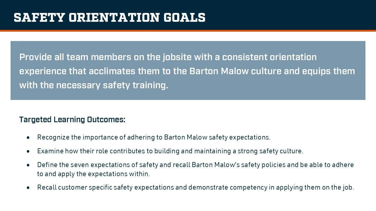 Project Goals: This in-person, instructor-led course is designed to create an engaging, consistent safety orientation experience that acclimates team members to the Barton Malow culture and gets them excited and motivated to continue working for us in the future; Ensure all team members are equipped with the necessary safety training and are able to retain and apply what they’ve learned on the job site; Convey Barton Malow’s #1 safety objective of “zero incidents and zero injuries” and persuade participants to voluntarily adopt safe work practices; Equip trainers (safety professionals, superintendents, project engineers…) to deliver high quality, engaging, standardized training content and convey the importance of their role as trainer.