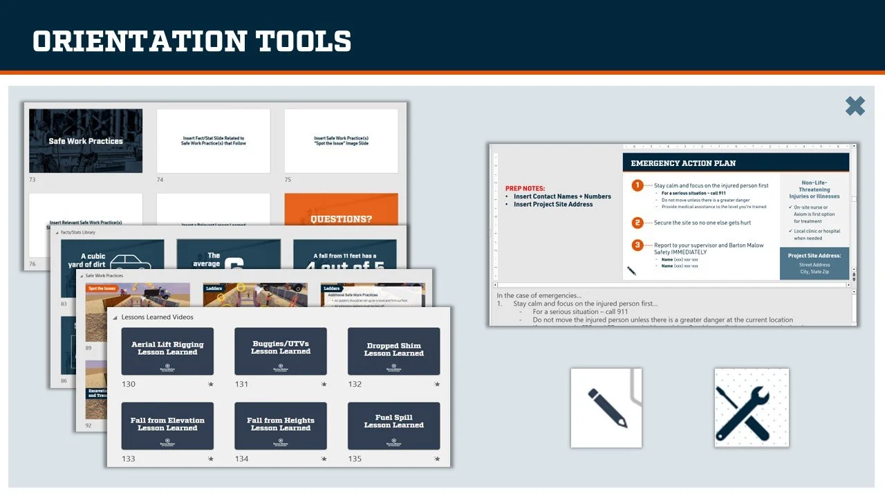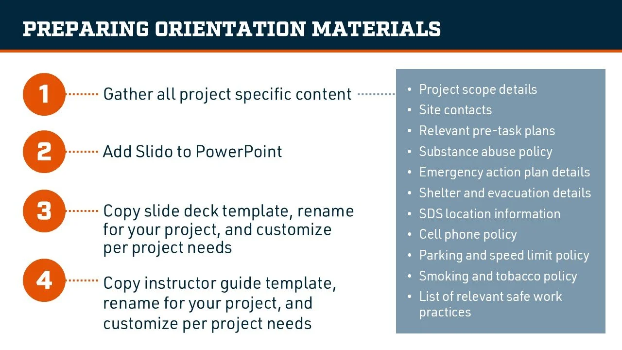 The jobsite specific policies, procedures, and hazards should be customized per the jobsite requirements. However, the expectation is that facilitators will use templated slides as a starting point. Content library sections were built into the slide deck to allow facilitators to build out the Safe Work Practices of the orientation. This section of content may vary greatly project to project and over the lifecycle of a project. Content libraries include slides for: Safe Work Practices, Lessons Learned, and Facts/Stats.