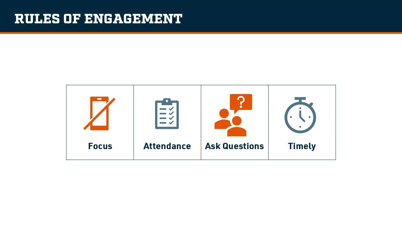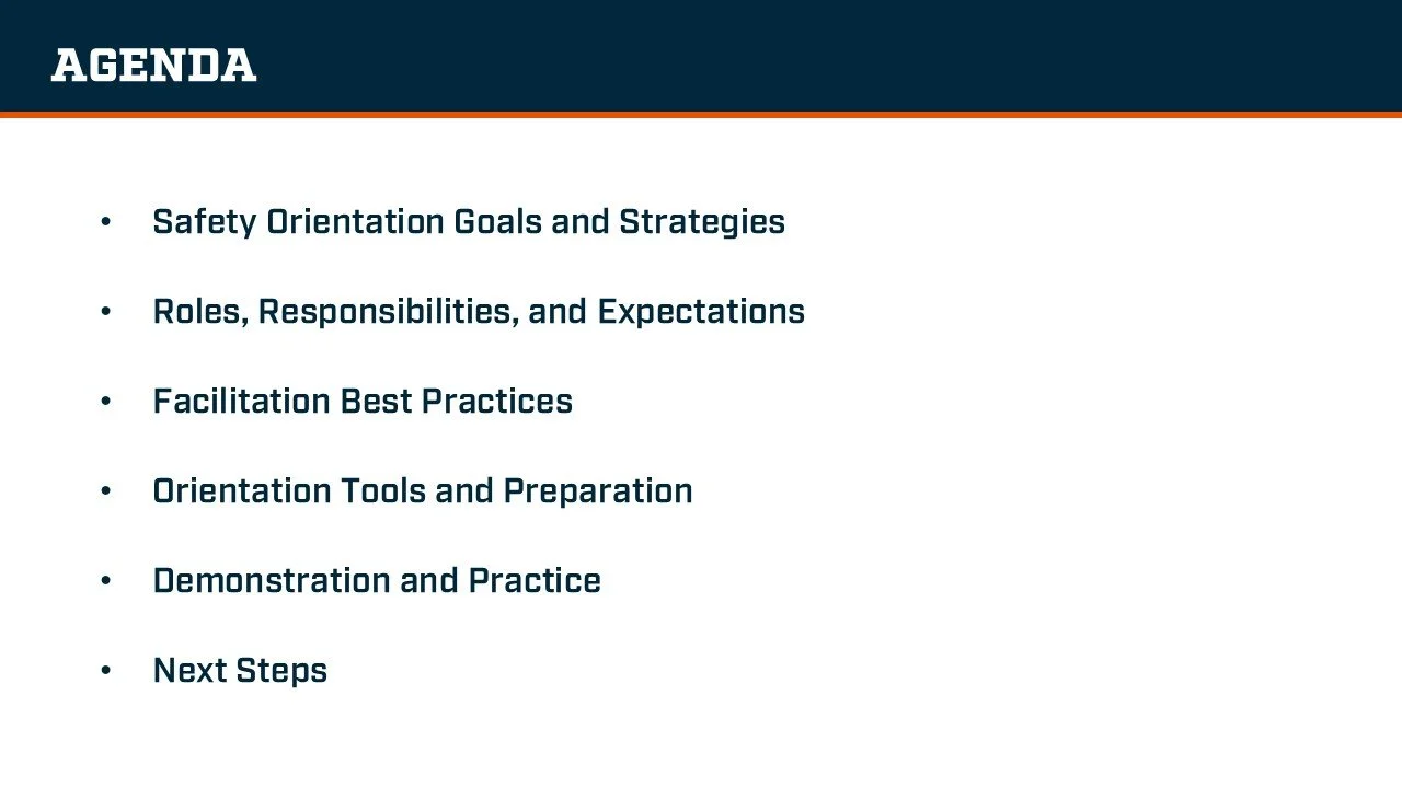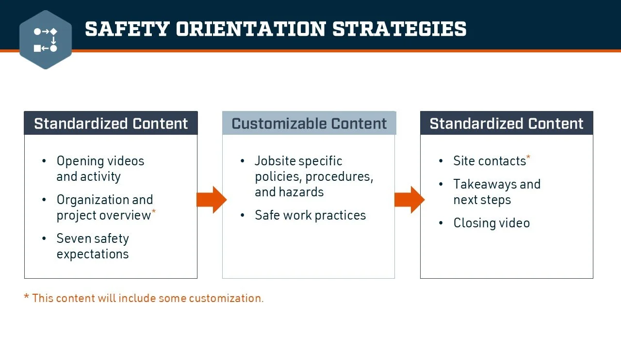 The orientation covers an overview of the organization and project, seven safety expectations, jobsite specific policies, procedures, and hazards, and safe work practices. Some of this is standardized content and some of it is customizable, enabling facilitators to develop the orientation with the unique needs of the project in mind. This flow of learning and structure helps to create a consistent experience for all team members. Throughout the orientation we utilize lecture, discussion, activities, video, illustration, examples, knowledge checks, practice, and guided notes to encourage engagement, hold attention, and cement learning. Audience participation is an expectation.
