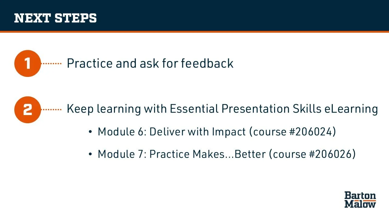 Takeaways, next steps, and closing video are intended to set the tone again and inspire action.